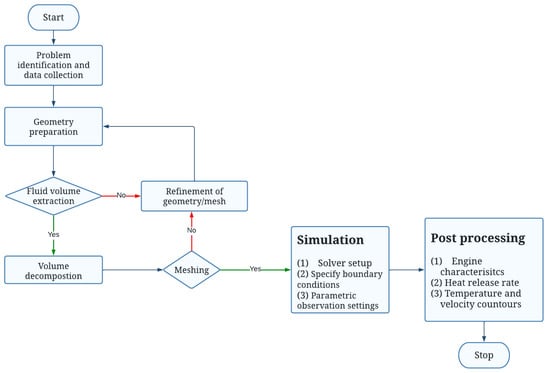 The combustion sector simulation was carried out with Ansys IC engine fluent tool. Firstly, a flat combustion chamber was prepared similar to the Kubota V3300 engine model by maintaining the engine’s bore, stroke, compression ratio, and displacement. Figure 1 presents the process flowchart for engine simulation. The simulation methodology contains three main parts—geometry preparation, simulation, and post-processing. Geometry preparation is essential to fluid volume extraction and meshing. Data related to valve positions, valve seats, port alignments, and positions were gathered and accommodated in preparing the combustion chamber. Later, the chamber was updated with respect to fluid extraction and meshing errors. A computational mesh was created to calculate the results at each time step []. The input variables and initialisation process were carried out during the simulation setup, and the analysis was performed during the post-processing stage. Later, bowl shapes were designed by adjusting the clearance volume to maintain the engine compression ratio and displacement. A detailed explanation of these stages is explained in the following sections.