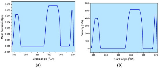 Fuel injection profiles: (a) injected fuel mass vs. °CA; (b) injected fuel velocity vs. °CA.