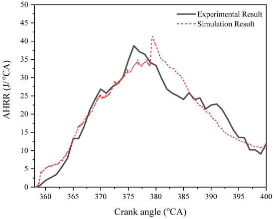 The FCC simulation setup was validated against experimental data considering the heat release rate. The purpose of this validation was to examine the in-cylinder combustion behaviour of the modelling setup at constant boundary conditions with respect to the combustion condition of the test engine. The model was validated with a single injection profile (with an injection period between 356 °CA and 376 °CA), similar to the test engine injection. As presented in Figure 5, a similar trend is noted in both the experimental and simulation setup. The trend was observed during the combustion stroke between crank angles of 350 °CA and 400 °CA. The results are validated by adjusting the injection profile with respect to the crank angles. The error percentage between the actual and simulated output was calculated as 3.8%. Though there is some discrepancy in both graphs, the overall error percentage is less than 5%, and the heat release rate trend is good.