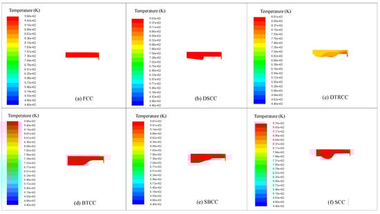 Figure 7 illustrates the temperature distribution of the chamber at the end of the compression stroke at 344 °CA. The results show that varying the bowl shape has a visible impact on the compression rate, which is one of the primary operating parameters for a compression ignition engine. As shown in Figure 7, the SCC (970 K) showed a high-temperature formation than the reference piston FCC (968 K), followed by the SBCC (967 K) and BTCC (966 K). The DTRCC demonstrated inferior temperature formation (748 K to 815 K) during the compression stroke, which may be due to a longer bowl diameter. For the DTRCC, it can be seen from the temperature plots that the crevice region has high-temperature formation, which can cause rapid and poor combustion in crevice regions. Several studies have reported high unburnt hydrocarbons and NOx emissions when combustion occurs in crevice regions of the chamber [,].