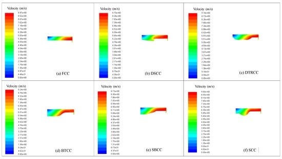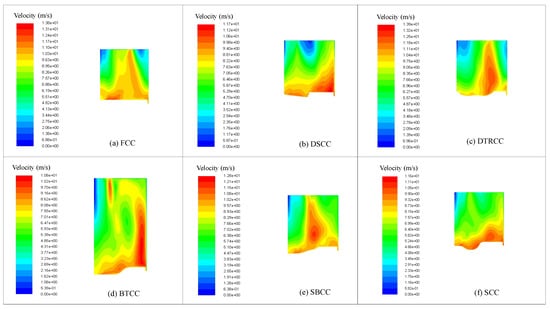 Figure 12 and Figure 13 show velocity distributions at 431 °CA and 467 °CA for different modified chambers. It is observed from the results that higher velocity magnitudes are recorded on top of the piston surface as the piston moves towards the bottom dead centre BDC. Here, the velocity counters represent two main activities: turbulence and piston work []. The high velocities situated on the piston head for the SCC (approx. 10.5 m/s) generate significantly more power during the power stroke. In the case of the FCC, the fluid streams dispersed around the piston surface, showing higher velocities than other chambers due to the absence of a bowl region. Furthermore, the DTRCC with a broader bowl exhibited poor velocity distribution due to the formation of less turbulence inside the chamber. Higher magnitude of velocity regimes, 13.9 m/s at 431 °CA and 15 m/s at 497 °CA, were noticed for the DTRCC. However, the irregular velocity stream distribution was recorded for the DSCC due to the uneven turbulence distribution of fluid streams.
