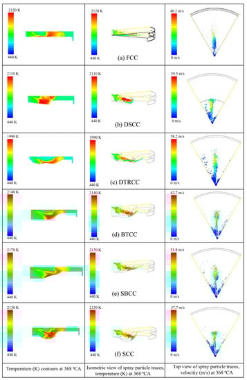 Figure 9 presents the fuel particle distribution with respect to velocity and temperature at 368 °CA during the injection period, which is near the top dead centre (TDC). The DSCC (2170 K) and BTCC (2140 K) showed high-temperature formation rates during the injection period compared with the FCC (2120 K). Due to poor compression rates, the DTRCC showed lower temperature formation at 1990 K compared with other chambers.