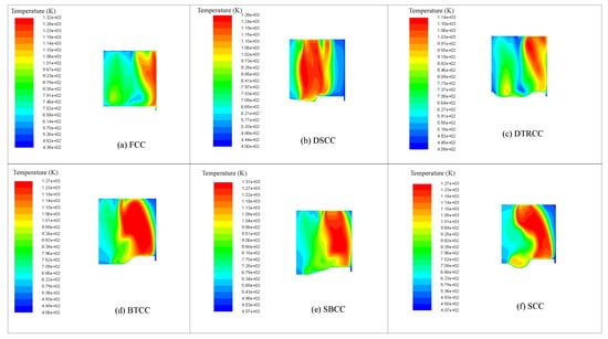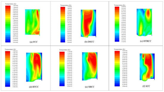 Figure 10 and Figure 11 show the in-cylinder temperature distribution for modified chambers during the middle and end of the combustion stroke at crank angles of 431 °CA and 467 °CA, respectively. As presented in Figure 10 and Figure 11, the chambers with fewer bowl obstructions, such as the FCC and DTRCC, revealed that combustion spreads towards the cylinder wall region with respect to fuel droplet dispersion. Furthermore, because the spray mixture is more prone to hit the walls, it can cause combustion near the wall region. Therefore, there are higher chances for cylinder heat loss as the high-temperature areas are situated alongside the wall. Moreover, compared with other bowl chambers, the FCC and DTRCC showed combustion formation in the crevice regions (Figure 10 and Figure 11). However, the bowl chambers of the DSCC, BTCC, and SCC, showed high-temperature distribution during the combustion stroke, indicating that combustion happened alongside the bowl region. A poor temperature distribution was noted in the DTRCC, where the combustion occurred near the squish region because of the shorter squish area and wider bowl chamber.