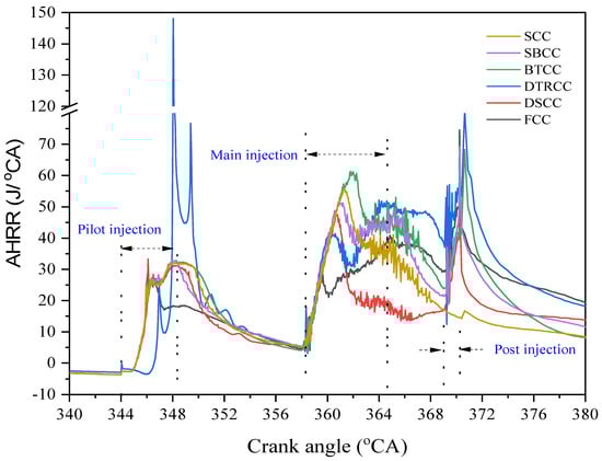 The apparent heat release rate (AHRR) for different modified chambers is illustrated in Figure 14. The three humps during the injection were mainly due to the compound HRR caused by multiple split injections. Compared with the reference FCC, all the piston bowl chambers showed high HRRs with pilot injection. This may be due to the increased turbulence rate generated by the piston bowl chambers during the injection stages. The AHRR in the DTRCC was high and more rapid than in the other chambers. However, temperature plots (Figure 10 and Figure 11) and velocity plots (Figure 12 and Figure 13) showed poor combustion rates and spatial distribution within the DTRCC. The main reason for these poor temperatures, velocities, and HRR was uneven and rapid combustion. Furthermore, as knocking intensity is proportional to peak HRR, the DTRCC is more susceptible to generating knocking under high turbulence conditions.