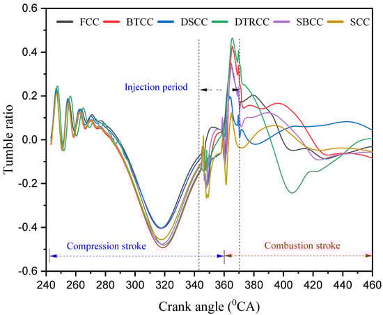 Figure 16 shows the tumble ratio for different piston bowl geometries with respect to crank angles. The magnitude of the tumble and swirl ratio follows the right-hand rule; hence, the negative ranges in the graphs (Figure 15 and Figure 16) represent the counter-clockwise direction of the flow []. When comparing both motions, we observed that the swirl ratio was more dominant in these chambers compared with the tumble ratio. During the suction stroke, near 243 °CA to 280 °CA, variations in tumble motions were observed; meanwhile, during the compression stroke, a negative trend in the tumble ratio was noted. Again, during the combustion stroke, variation in the tumble ratio was seen. For the DTRCC, SBCC, and FCC, a peak tumble ratio was observed over other chambers, which was the opposite of the swirl ratio results. Furthermore, a high tumble ratio was observed during the combustion stroke, whereas a high swirl ratio was observed during the suction stroke.