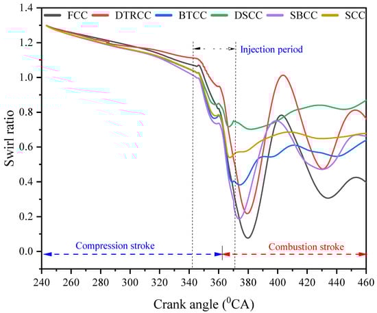 Variation of swirl ratios for different geometries with respect to crank angle.
