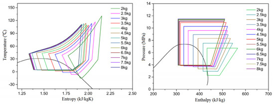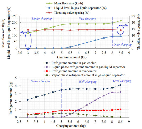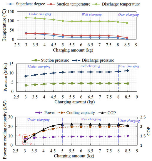 - As the CO2 charging amount varied from severely insufficient to overcharged (2 kg-5–8 kg; seriously insufficient at 2 kg and stable from 5 kg to 8 kg) the transcritical CO2 cycle varied from the low-pressure overheat region to the high-pressure liquid region.