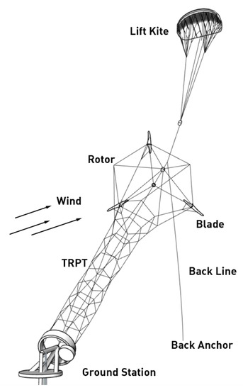 The lift kite is represented as a static point force. Using the lift-kite area, S; the lift coefficient, ; and the drag coefficient, , the calculations of lift-kite aerodynamic forces are given in (2). The values taken were: , and Assuming the elevation angle of the lift-kite tether is equal to the elevation angle, , of the TRPT and rotor, the lift kite’s aerodynamic force, which is in-line with the lift-kite tether , can be calculated by
