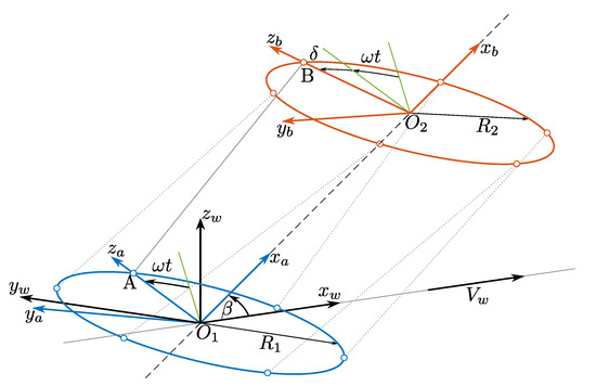 As shown in Figure 3, there are two rings in a single TRPT section, the lower ring with radius and the upper ring with radius , sharing the same axis of rotation (–), inclined to the wind velocity vector, , by an elevation angle of . Point A and Point B are at the two ends of a tether adjacent to the two rings. Three reference frames are used in Figure 3.