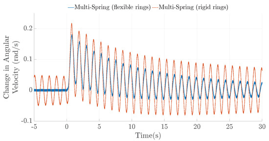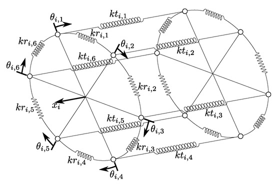 The point masses are constrained to move around the circumference of the ring and all the masses on the same ring are constrained to move axially together due to the DoF, . All the masses on a single ring have the same axial displacement. With each ring having rotational and one axial DoF, the total number of DoFs for each ring within the TRPT is, therefore, . For the current Daisy Kite TRPT design, each ring has seven degrees of freedom (Figure 5). Similar to the spring-disc model, the multi-spring model was defined and solved using cylindrical coordinates.