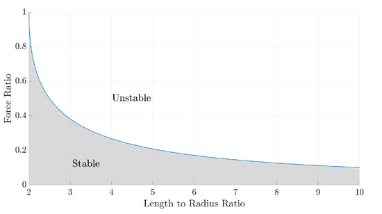 The above torsional stiffness originates from the geometric stiffness of a TRPT section that provides information about the stability of the two steady-state torque solutions. A positive torsional stiffness shows that the steady-state solution is in equilibrium, as the tether forces are acting in the opposite direction to the torque being transmitted, therefore cancelling each other out, whereas a negative torsional stiffness shows that the system is not in equilibrium as the tether forces are acting in the same direction as the torque being transmitted. Before a negative stiffness occurs, there is an operating point at which the stiffness becomes zero; this corresponds to the torsional deformation at which the maximum amount of torque can be transmitted.
