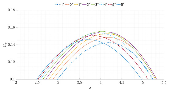 Given the wide and extensive use of NACA aerofoil profiles, the aerodynamic performance coefficients for the NACA 4412 foam blades were defined based on wind-tunnel test data from the available literature and Xfoil. Provided with the 2D shape of an aerofoil, Xfoil calculates the lift and drag coefficients for a given and Mach number. The foam blades have a span of 1 m and a constant chord length of 0.2 m. The for the foam blades is calculated to be 1.4 × 105 and to be 5. The results presented in [23], along with the predictions from Xfoil [24], were used to define the lift and drag coefficients for the foam blades for angles of attack in the range from −10° to 110°. For values outside of this range, similar to the HQ kites, the coefficients were calculated using NREL’s AirfoilPrep.