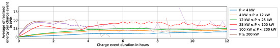 Energy consumed by charge event duration and charging station power level. Example of how to read it: if a charge event occurs at an EVSE with a rated power between 12 and 25 kW and lasts 4 h, a sum energy of 22 kWh would be probably consumed. The data shown are similar to that in Figure 5 in [16], but with the time range used in this study.