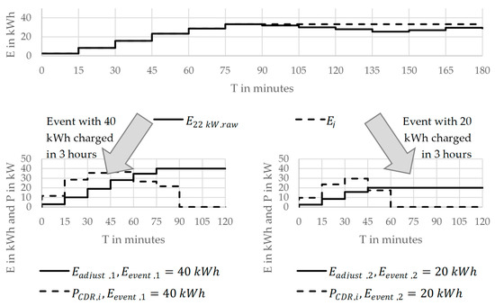 For the EVSEs whose full history of CDRs is known, the known energy consumed for each charge event needs to be transformed into a power consumption curve. Given that the shape of the power drawn for each individual event is unknown, a power profile can be created as follows. The power profiles generated from the collection of all CDRs explained in Section 2.1.1 should be matched to individual CDRs as shown Figure 2.