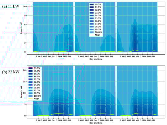 Distribution (area plot) and mean (line) of EVSE power flow by day type and time of day. The y-axis is limited to the EVSEs’ installed power. When working with the curves, keep the constituting area types for each power level shown in Table 1 in mind, particularly with a view on EVSEs with a rated power of 11 kW. Percentage values in the legend describe the share of points that lie beneath the indicated line. Example of how to read it: on a Saturday at noon, 95.5% of EVSEs with a rated power of 22 kW see a power flow of 7.71 kW or less.