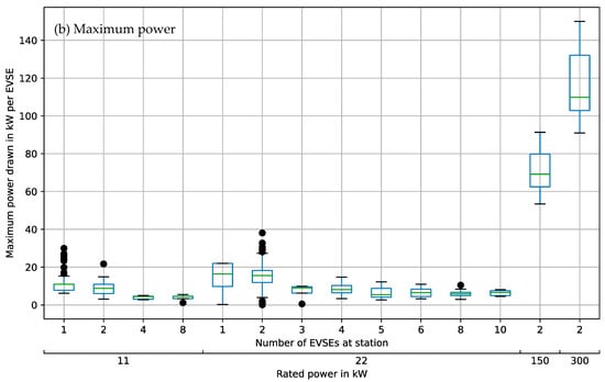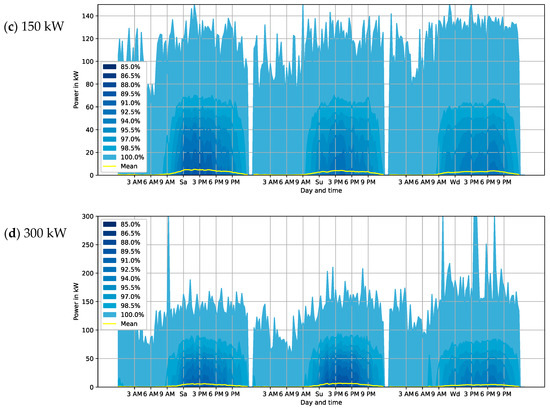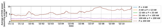 A third limitation is that the charging patterns have undergone a highly dynamic evolution over past years and it seems highly likely that this will continue to be the case. More vehicles sharing a single EVSE, higher charging powers, a more diverse user base, and many other factors would contribute to changing utilisation patterns. As Figure 7 shows, small changes especially for higher power levels are already visible within the one-year period. Unfortunately, it is not possible to differentiate between seasonal effects and effects due to the continuously changing market as doing so would require a steady-state situation as a reference. Determining the exact shape and influence of the long-term changes on the load profiles is beyond the scope of this study as the data-driven approaches such as those used in this paper can only represent the present and past. Interested readers should therefore check whether the overall patterns shown are still valid and may adjust the curves’ amplitude according to their observations and assumptions. Some guidance may be obtained from tools such as the StandortTOOL [25] or model-based approaches [7,10]. Some trends that may be hypothesised are that more vehicles per EVSE will result in a higher average loading and a flatter loading curve. With increasing battery capacity per vehicle, it also appears probable that average charging powers at fast-charging stations will rise in future.