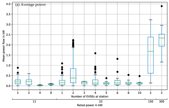 Additionally, it is found that the upper deciles are significantly higher than the average load per station. This indicates that the instantaneous power demand is much higher for certain stations and days. For the 22 kW EVSEs, the maximum instantaneous power demand is more than 20 times higher than the average power demand. This implies that the power grid supplying a single EVSE must be able to deliver the promised 22 kW; but as long as many are aggregated, the grid capacity can be much smaller than the sum of all installed capacity.