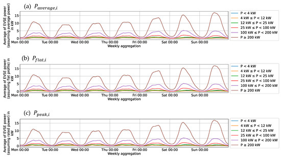 The values underlying are the average values that may hide extreme values. To account for this, the flat and the peak estimation were developed. The flat estimation evenly spreads out the energy recharged during a charge event over time and is consequently a grid-friendly charging mode. The peak estimation charges at peak power until the energy according to are transferred and subsequently become 0. Both approaches are unrealistic and meant to define the two extremes between which the real usage lies. That is, the flat profile would require the exact knowledge of the duration of stay for an individual EV; the peak profile would require the vehicle to accept the rated power of the EVSE and to suddenly stop charging after a given energy transfer.