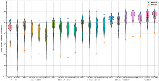 Figure 8 augments the previous analysis by showing how much energy various EVSEs provide depending on their power levels and whereabouts. Note that the plot is made with a logarithmic scale, and it is quite clear that there are major differences between various EVSEs.