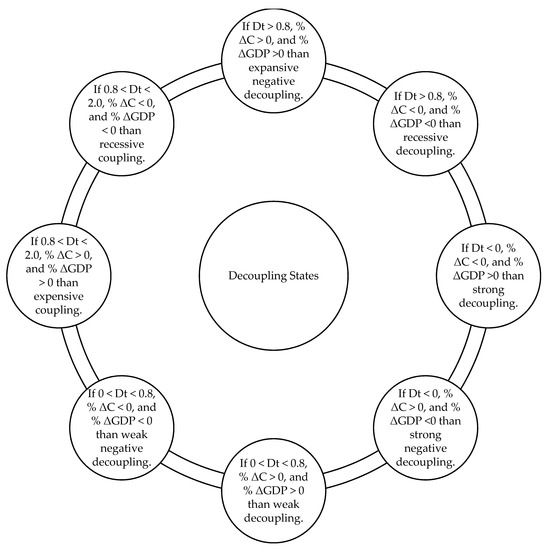 Several unlike theories have been used to show the various features of decoupling [17]. For instance, decoupling by equation one of this study is likewise denoted as non-materialized, qualitative evolution, and structural variation [18]. The decoupling stated by equation two of this study is also referred to as dematerialized, economic effectiveness, and elementary practical growth [18,19]. Decoupling stated by equation three of this study may also be stated as non-carbonization, non-relating, and dissimilar element theories [19]. Occasionally de-linking is used as a broader replacement for decoupling, irrespective of the theory’s particular meaning [17].