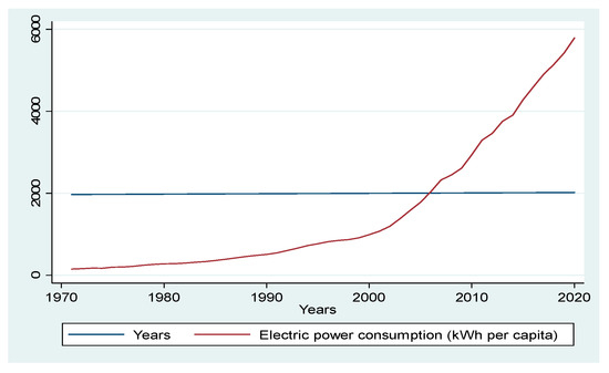 The electric power consumption trend for the economy of China for the period 1971–2020.