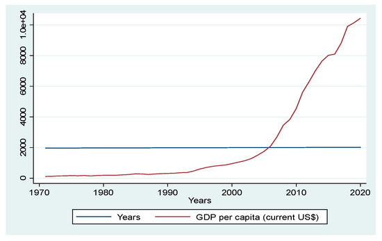 Figure 2 shows the electric power consumption trend for the economy of China from the period 1971–2020. In Figure 2, the X-axis illustrates the annual time window, and the Y-axis presents electric power consumption in kWh per capita. It shows the upward trend in the graph, which indicates electricity demand is increasing over time. This trend shows that the increasing domestic electricity demand in households and industries in China is drastically increasing due to economic development. Figure 3 depicts annual measures of GDP per capita for the economy of China from the year 1971 to 2020. In Figure 3, the X-axis exhibits the yearly time frame, and the Y-axis shows GDP per capita in US dollars and depicts an upward trend over time. Figure 4 displays the CO2 emissions trend for the economy of China from the period 1971–2020. In Figure 4, the X-axis presents CO2 emissions in metric tons per capita, and the Y-axis illustrates the annual time–space. The increasing trend in CO2 emissions shows a sharp increase over time due to economic expansion, energy production, industrial development, and the use of devices and machinery.