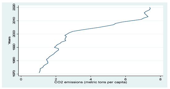 Several practical researches investigated whether to confirm or discard the EKC hypothesis. The outcomes of the research differ intensely by state, period, and the set of environmental factors examined [21,22]. Some researchers have proposed that in various western industrial nations, concerning entire material streams and CO2 emissions, the hypothesis did hold for the period from 1970 to 1985, but not after that [22]. The EKC defined the growth of sulphur discharges (measured in SO2) as somewhat sound, as it was not as effective in relating the development of nitrogen dioxide emissions and the minimum effective link to CO2 emissions growth in the UK, USA, western Germany, the Netherlands, and Finland [19]. According to prior studies, the reversed U-curve of CO2 emissions has somewhat changed to an N-curve. As the reversed U-curve signifies de-linking or dematerializing, the latter stage of the N-curve is defined by the terms relinking or re-materialization [17].