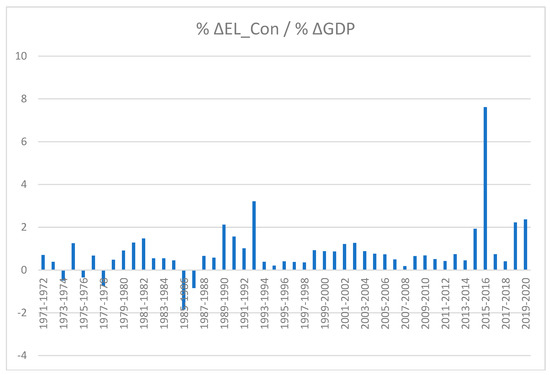 Decoupling electricity consumption from economic development defines the values of elasticity under 1.0, where the percentage change in electricity consumption (%ΔEL_c) is divided by the percentage change of economic growth (%ΔGDP_g) in a given period.