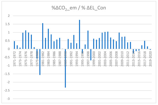 EL_c elasticity of CO2_em = %Δ CO2_em/%Δ EL_c