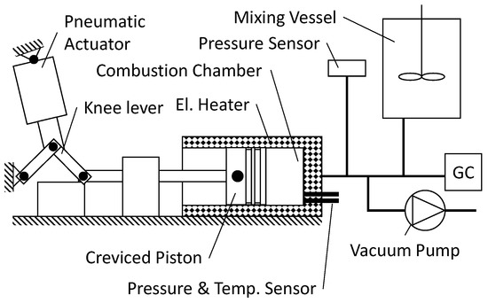 The experiments were performed in a rapid compression machine (RCM), which is explained in detail in [70,71,72]; a brief overview of that RCM is given here. Figure 1 depicts the experimental setup of the RCM and the experiment.