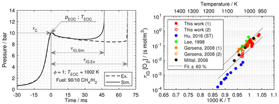 with as the IDT of a dedicated experiment, as the corresponding mole fraction, R as the gas constant and as the temperature at the end of compression. For these calculations, the ideal gas law was assumed. The comparison of the studies by the scaled IDT is shown in Figure 2 (right), whereby different colors denote different RCM facilities with different heat losses (except [24] (blue bullets) with a shock tube). H2 is one of the most frequently measured fuels in RCMs and STs apart from CH4; however, our CH4 data were already published in [69], and we, therefore, chose H2 here. The IDT results of the mentioned studies and our work show good agreement. Based on the depicted IDTs from RCM experiments, an Arrhenius-like fitting curve was calculated,