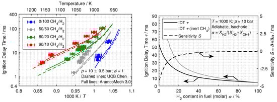 is the calculated IDT shown in Figure 3 (right) as a black line. The corresponding sensitivity according to Equation (7) is shown in Figure 3 (right) as a black dashed line. Low values of the H2 content (low H2 mole fractions) were the most sensitive to increasing , meaning that small additions of H2 had the highest impact on reducing IDT at constant pressure/temperature. The more H2 mixed into the fuel, the less sensitive the system becomes for H2 addition according to the IDT. Note that, if CH4 is treated as an inert species and everything else is kept constant, the reactants (H2/O2) no longer form a stoichiometric mixture but lean mixtures instead and, thus, ignite later than their stoichiometric counterparts [24].