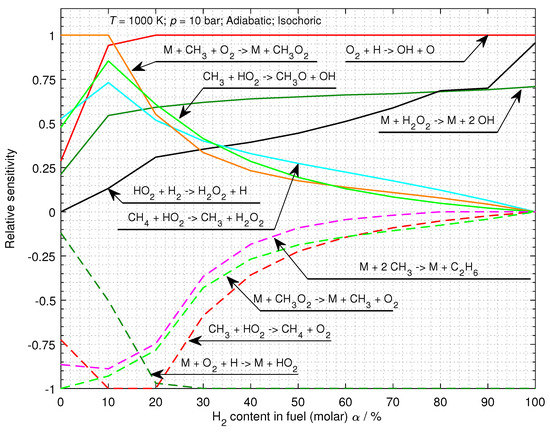 Figure 4 shows the relative sensitivities of the OH radical (concentration). Full lines refer to positive sensitivities, and dashed lines refer to negative sensitivities. All sensitivities were calculated for an adiabatic and isochoric system for the time right before the gas mixture ignites (). The initial conditions were and with a variable H2 content (CH4/H2 ratio, Equation (4) and a constant Ar/O2 = 3.76 (molar) ratio.