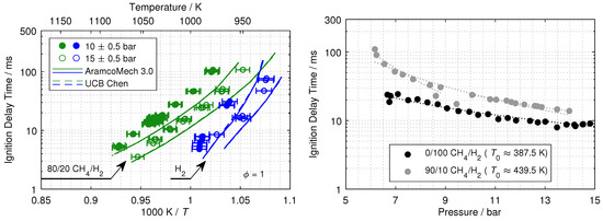 Figure 5 (right) compares the ignition delay times of a fuel mixture of 90/10 CH4/H2 and pure H2 as a function of pressure. The compression temperatures for both gas mixtures are in a narrow temperature range since the initial temperature is held constant. The compression temperature of the CH4/H2 mixture is = 1040–1070 K, and the compression temperatures for the pure H2 experiments are between = 970 and 1000 K. Increasing the compression pressure from to 15 bar, the IDT drops for both fuels. Here, the CH4/H2 mixture shows a stronger pressure dependence for the IDT when compared with H2.