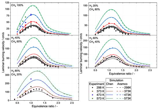 Comparison of the laminar burning velocity of a methane–hydrogen mixture () for different temperatures ( 298, 373, 473 and 573 K) to the experimental literature data from Table 2.