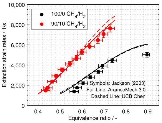 Experimental [65] and modeling results for the extinction strain rate of 0 and 10 mol−% H2 in a premixed CH4 flame () as a function of the equivalence ratio.
