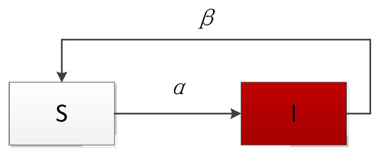 In this study, we mainly used the SIS disease propagation model shown in Figure 2. The SIS model is generally used to describe diseases, such as influenza, where individuals cannot gain immunity after being cured and can still be re-infected. In this case, individuals in a susceptible state have a probability α of contracting the disease and thus becoming newly infected, and the probability of an infected individual being cured is β. The mechanism of infection can be described as follows [16].