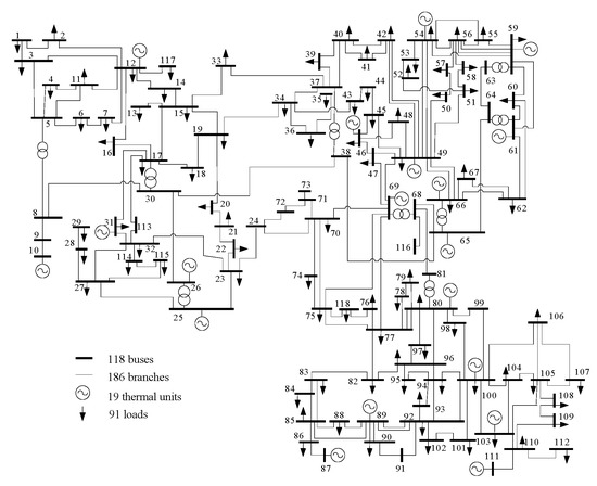In this study, we used the IEEE 118 bus test system as the physical network. The IEEE 118 bus test case represents a portion of the American electric power system (in the midwestern US). It contains 19 generators, 35 synchronous condensers, 177 lines, 9 transformers, and 91 loads. In addition, the cyber network presents scale-free characteristics, in that most nodes in the network are connected only to a few nodes, and a few nodes are connected to a large number of nodes. Then we randomly generated a scale-free network with 118 nodes to represent the cyber layer. Each layer had a different subnetwork structure. All nodes in the two-layer network were arranged in descending order according to the size of the degree, and the corresponding nodes in the subnetworks were then connected in sequence. On this basis, with one-to-one coupling, a two-layer interdependent network model of 236 nodes, namely the cyber-physical power system model, was constructed. When a node was randomly infected, both subnetworks adopted the SIS disease propagation model, and the cyber nodes and physical grid nodes were considered as individuals in population 1 and population 2, respectively, to analyze the failure propagation process in the two groups. The flowchart is shown in Figure 5 below. The failure does not disappear in the cyber-physical power system at dynamic equilibrium. The main comparison is between the failure propagation rate and the recovery rate, and if both reach a certain ratio, the system enters a new stable state. The specific figures are shown in the following simulation results and analysis.