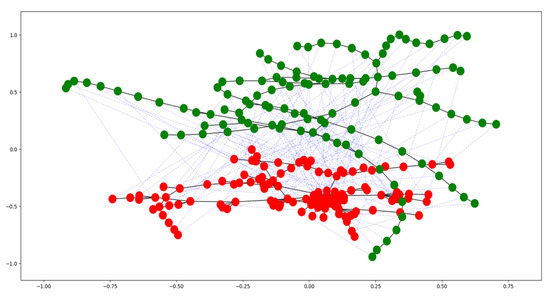 In Figure 9, the solid lines refer to the actual edges in the subnetwork, the dashed lines are the inter-layer coupling edges, the red nodes indicate the cyber network, and the green nodes indicate the power network.