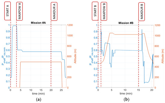 This research examined two mission profiles reported in Figure 2, a simple delivery trip (Mission A for “Transport”), and a search-and-rescue (SAR) mission in a mountain environment (Mission B for “Mountain Rescue”). These missions were also used to generate several points for engine failure, as shown in Table 3.