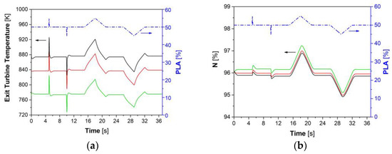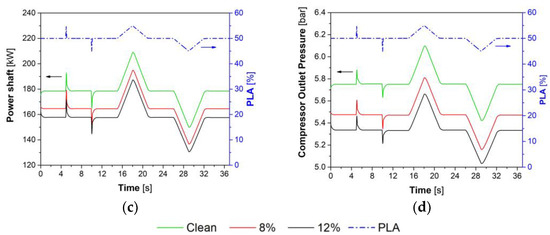 Figure 4 shows the results of the linear model for the clean and damaged compressor at two different levels of compressor degradation and flow coefficient (8 and 12%, respectively), when small PLA perturbations were enforced according to Figure 3. For each case, a sudden increase in fuel flow rate caused a rise in turbine exhaust gas temperature (Figure 4a) and turbine speed (Figure 4b), and, consequently, a higher power at the turbine shaft (Figure 4c). The higher shaft speed increased the compressor pressure ratio, as shown in Figure 4d. The inverse behavior for the same output variables was obtained when the fuel flow rate was reduced.