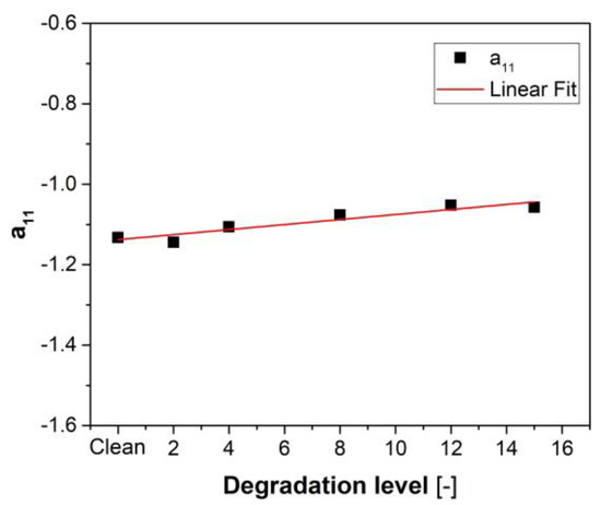 As Equation (11) shows, each term of the linearization matrices represents a physical property of the aero-engine system. As for Equation (11), for instance, a11 represents the time constant of the engine through the correlation [12]. Hence, a11 was expected to be negative; moreover, with increasing compressor degradation, a11 increased (Figure 6). This indicates that, as expected, a damaged compressor contributes to retarding the time of response of the shaft. As for b11, this coefficient correlates the shaft acceleration to a fuel flow rate variation. Therefore, when an increase in fuel flow rate is applied, a shaft acceleration is expected. When the compressor is damaged, the higher the degradation level, the slower the shaft accelerates. The linear trend is observed in Figure 6.