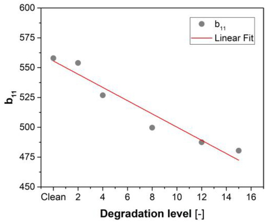 Coefficient b11 computed from linearization for different levels of compressor degradation (dots) and the linear fit curve.