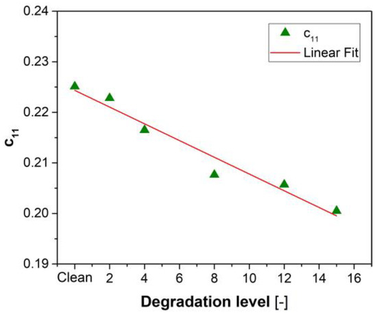 Coefficient c11 of Matrix C computed from linearization for different levels of compressor degradation (dots) and the linear fit curve.