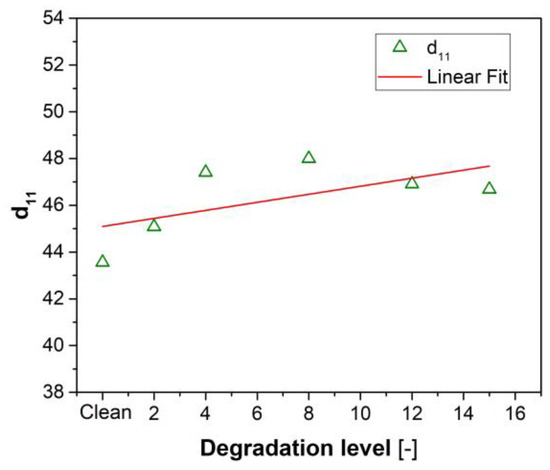 Coefficient d11 of Matrix D computed from linearization for different levels of compressor degradation (dots) and the linear fit curve.