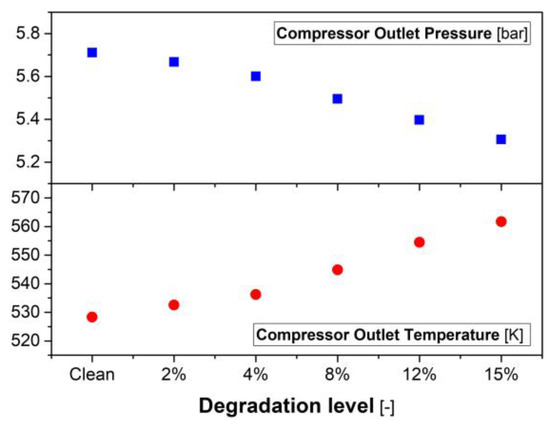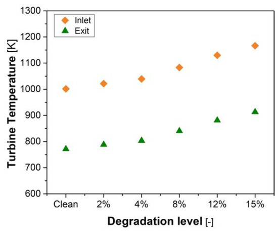 Finally, the achieved results allowed us to carry out an analysis on the effects of engine degradation on the output variables. A steady-state operating condition, in which fuel flow rate and engine speed were fixed (fixed PLA), was considered for different values of compressor degradation. Figure 9 (top) shows that the more the compressor was damaged, the lower the pressure and the higher the air temperature at the compressor exit. In particular, an efficiency drop of 8% caused a pressure reduction of about 4% and a temperature rise of 2.8%; if the compressor efficiency dropped by 12%, then the pressure reduced by about 7% and the temperature increases by about 4.5%. When the compressor is damaged, its performance map undergoes considerable changes. Therefore, at a fixed speed, lower air flow rates were processed by the compressor with respect to the clean case. Air flow rates reductions of about 8% and 12% with respect to the clean case were recorded for compressor efficiency reductions of about 8% and 12%, respectively. The lower air flow rates, at fixed fuel, caused a rise in the turbine inlet and exhaust temperature (Figure 10). Therefore, for a compressor degradation of about 8%, the inlet and outlet turbine temperatures rose by about 7%, while for a compressor degradation of about 12%, the temperatures rose by about 10%. Overall, engine performance deteriorated and lower power was obtained, as reported in Table 7. These results are in agreement with the literature data [46,50].