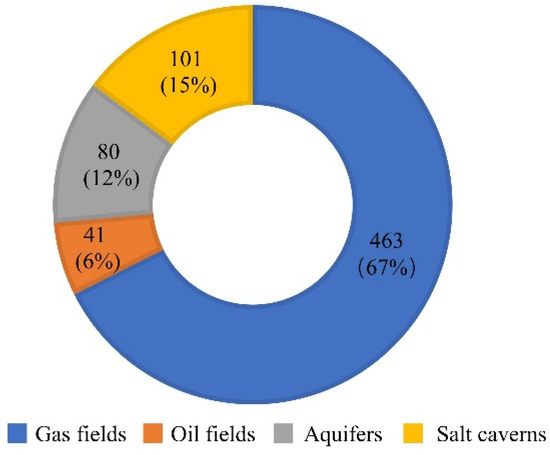 Target UGS regional structures include depleted oil and gas reservoirs, salt caverns, aquifers, and abandoned underground mines [16]. Due to the characteristics of geological structure and the traps sealing property, depleted oil and gas reservoirs are currently the mainstream way of using UGS [17,18]. As shown in Figure 1, 67% of the 689 UGS projects in operation around the world in 2018 came from depleted oil and gas reservoirs [19,20]. These 689 operating gas storage projects do not include EOR−related components. The Chinese government has also been committed to the construction of UGS in the past few decades, and the vast majority of them belong to this type of depleted oil and gas reservoirs. In 1970, Daqing Oilfield from China National Petroleum Corporation started the construction of China’s first UGS project [21,22]. The Dazhangtuo UGS was completed and put into operation in 2000. It was the first commercially operated UGS in China. [23]. Jintan UGS, as China’s first salt cavern−type UGS, began production in 2018 [24]. In order to meet the purpose of west−east natural gas transmission, China National Petroleum Corporation started the Hutubi UGS construction in 2013 and it was designed to be the largest UGS in China [25].