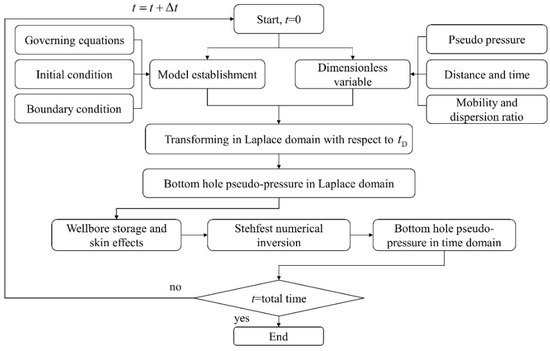 where is the wellbore storage coefficient and is the skin factor. As given in Figure 3, the Stehfest numerical inversion method was used to obtain a real−domain bottom−hole pressure solution [45]. Figure 3 shows the solution procedure for vertical and horizontal wells in the gas storage.