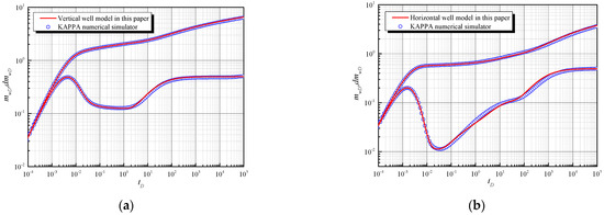 Pressure comparison results between the model in this paper and the numerical simulation from KAPPA: (a) the vertical well model; (b) the horizontal well model.