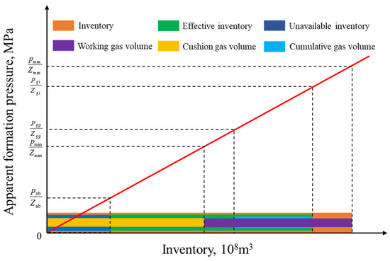 Lessons from the development of gas reservoirs indicate that the inventory evaluation parameters include inventory, effective inventory, effective gas volume, peak shaving gas volume, working gas volume, and cushion gas volume [50,51]. Similar to SEC reserves, effective inventory, effective gas volume, and working gas volume are key evaluation parameters for listing transactions, and they directly determine the market valuation of UGS companies. As shown in Figure 6, the effective inventory is equivalent to the technically recoverable reserves in gas reservoir engineering, and it is one of the parameters to measure the UGS performance. The material balance method in Equation (21) proposed by Tek can be used to calculate the effective inventory value [41].